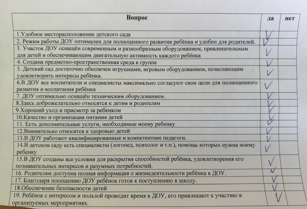 | 19. Ребёнок с интересом и пользой проводит время в ДОУ, его привлекают к участию в организуемых мероприятиях. | 91% | 9% | 96% | 4% | 100% | — |