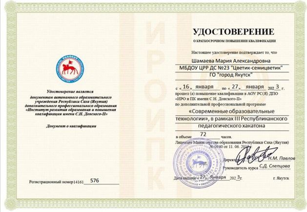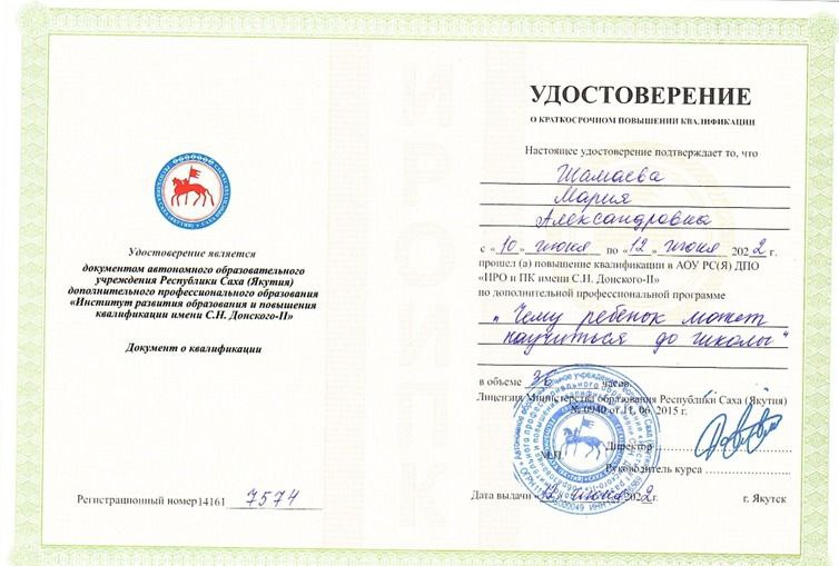 | 2 | АОУ РС (Я) ДПО «ИРО и ПК имени С.Н.Донского — II» | С 10 июня по 12 июня 2022 | «Чему ребенок может научиться до школы» | 36 |