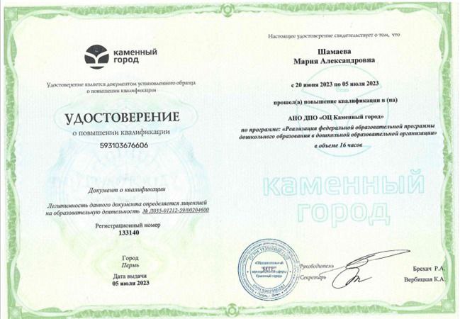 | 6 | АНО ДПО «ОЦ Каменный город» | С 20 июня по 5 июля 2023 | «Реализация федеральной образовательной программы дошкольного образования в дошкольной образовательной организации» | 16 |
