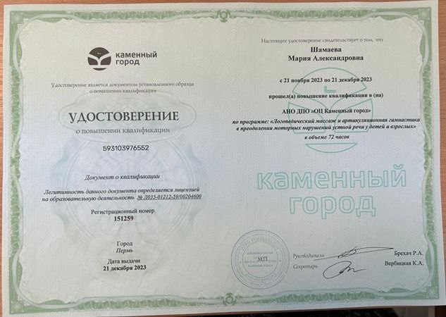 | 8 | АНО ДПО «ОЦ Каменный город» | С 21 ноября по 21 декабря 2023 г | «Логопедический массаж и артикуляционная гимнастика в преодолении моторных нарушений устной речи у детей и взрослых» | 72 |