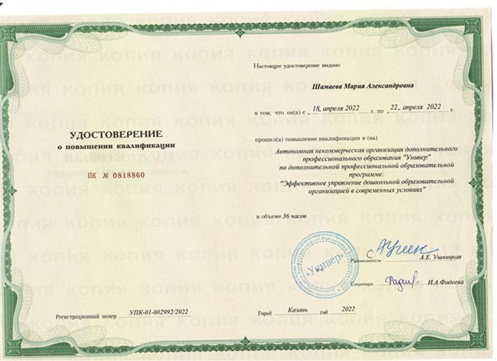 | 1 | АОУ ДПО «Универ» по дополнительной профессиональной образовательной программе | с 18 апреля по 22 апреля 2022 (очная учеба в составе делегации от Вилюйского улуса, г.Казань, Республика Татарстан) | «Эффективное управление дошкольной образовательной организацией в современных условиях» | 36 |