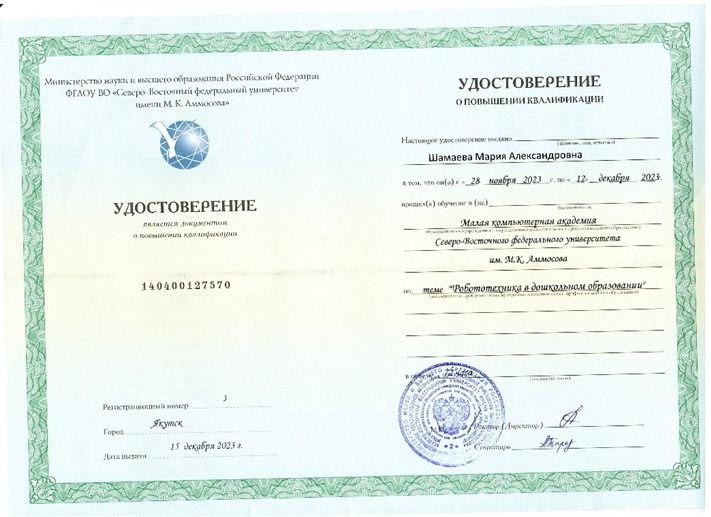 | 7 | Министерство науки и высшего образования РФ ФГАОУ ВО «Северо-Восточный федеральный университет имени М.К.Аммосова» | С 28 ноября по 12 декабря 2023 | «Робототехника в дошкольном образовании» | 72 |
