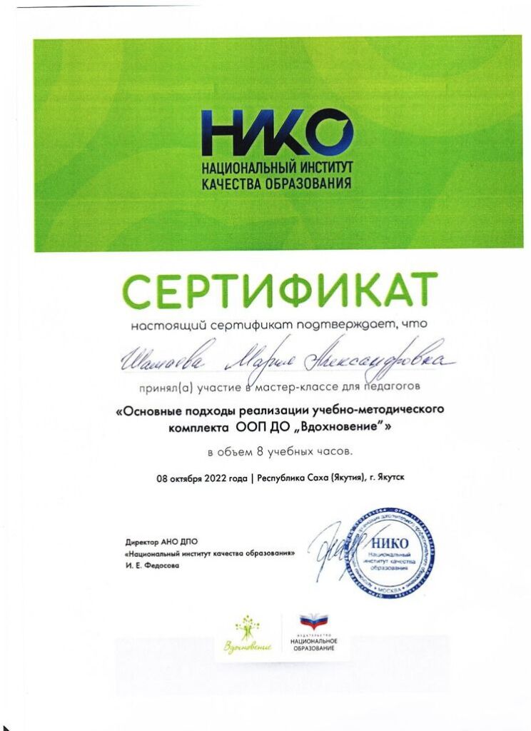 | 4 | АНО ДПО «Национальный институт качества образования» И.Е.Федосова | 8 октября 2022 | «Основные подходы реализации учебно-методического комплекта ООП ДО «Вдохновение» | 8 |