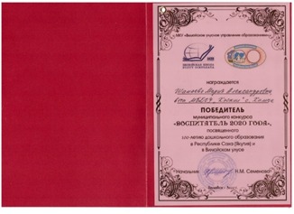 4Декабрь 2020г  муниципальный конкурс «Воспитатель 2020 года» посвященного 100-летию дошкольного образования в РС (Я) в Вилюйском районе,    1 место      г.Вилюйск