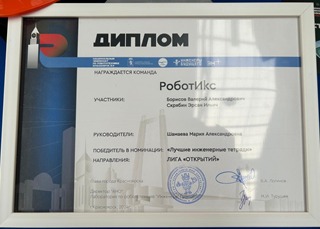 1Апрель 2024год.  Всероссийский национальный чемпионат по робототехнике Красноярск 5.0.Победитель в номинации «Лучшие инженерные тетради». Направления: «Лига Открытий» (2 детей, 2 тренера)г.Красноярск   Очное участие.