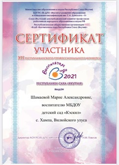 3      Декабрь 2021Республиканский конкурс «Воспитатель года 2021»сертификат участникаг.Якутск