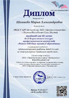 2  1 ноября 2023II Всероссийский конкурс профессионального мастерства «Педагог XXI века: тренды в образовании» «Интеллектуальное развитие детей 5-6 лет на этнокультурных традициях народа саха»        3 место