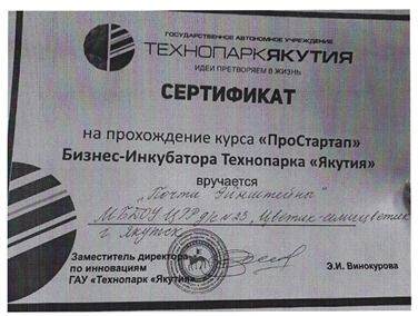 416-27 января 2023Республиканский   педагогический хакатонСертификат на обучение курсу «ПроСтартап» всей командой в Технопарке г..Якутскаг.Якутск